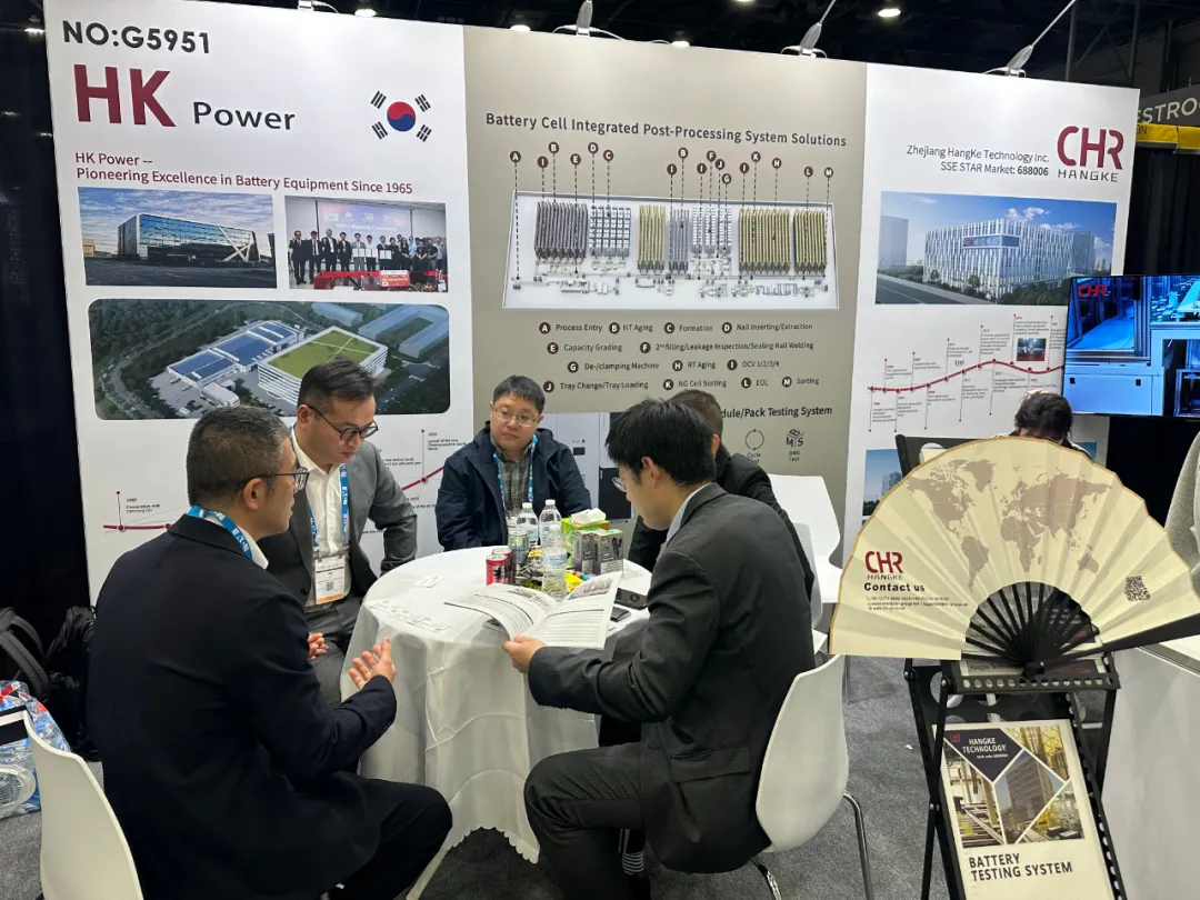 Detroit, the heart of the U.S. automotive industry, gathered the world’s leading players across the lithium battery value chain at this grand event. Hangke Technology’s exhibition spotlighted its integrated post-processing system solutions and battery cell/module/pack testing systems, covering the full range of processes such as Formation, Capacity Grading, and Testing — perfectly tailored for large-scale production of both power batteries and energy storage batteries.