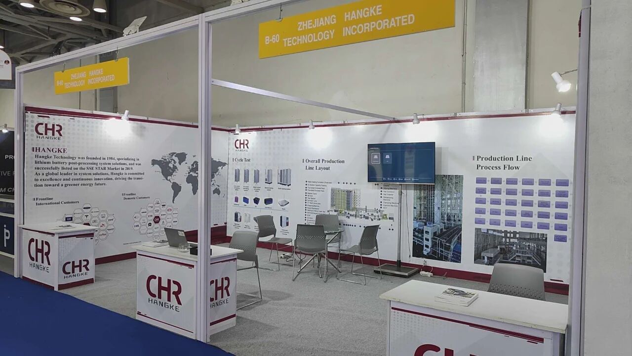 To fully showcase its brand strength at the exhibition, Hangke’s team made comprehensive preparations in advance. The booth adopted a single-open design, with a main backdrop emphasizing Hangke’s comprehensive solution capabilities in the lithium battery end-of-line sector, allowing visitors to immediately grasp the company’s core advantages.