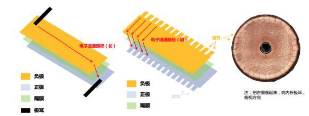 特斯拉 4680 电池采用的全极耳设计缩短了极耳传导距离。全极耳(无极耳)工艺的圆柱型锂电池,能量密度高,输出功率提升数倍,同样空间下车用搭载这种锂电池续航里程增加 13%,且电池成 本每千瓦时可以降低 10%以上。全极耳设计可以提升电池倍率+安全,提升电池续航和降低电池成本,有助于国内锂电池,尤其是大圆柱锂电池装机量再拓新的台阶。