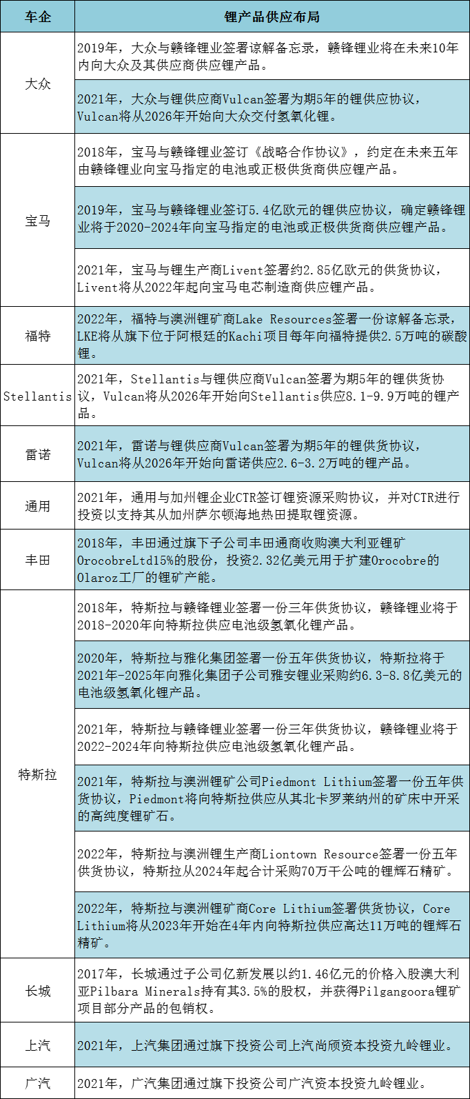 整体来看,国际主机厂在锂资源供应方面的布局主要是通过签署供货长单锁定上游优质锂盐/锂精矿产能。