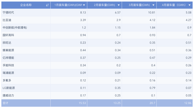 ▲表1. 1-4月主要动力电池的企业