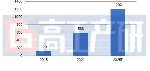 受锂电池产业近两年的扩产带动,我国锂电设备需求也在快速增长。据高工产研锂电研究所(GGII)数据显示,2021年中国锂电生产设备市场规模为588亿元,同比增长104.88%,较2015年的120亿元增长了3.9倍。GGII预计未来几年锂电设备市场规模仍将高速增长,到2025年,中国锂电设备市场规模将达1200亿元,2021-2025年年均复合增速19.52%。
