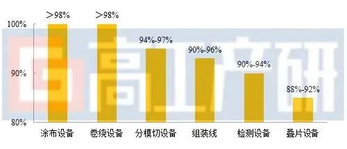 随着国内制造水平的提升,目前卷绕机等锂电池中段设备的国产化率已高达98%以上。锂电池设备中段环节主要包括模切(用于叠片工艺)、卷绕或叠片、包胶、电芯预封装(入壳、焊接、极干燥)、注电解液、封口等工序,对精度、效率、一致性要求较高。