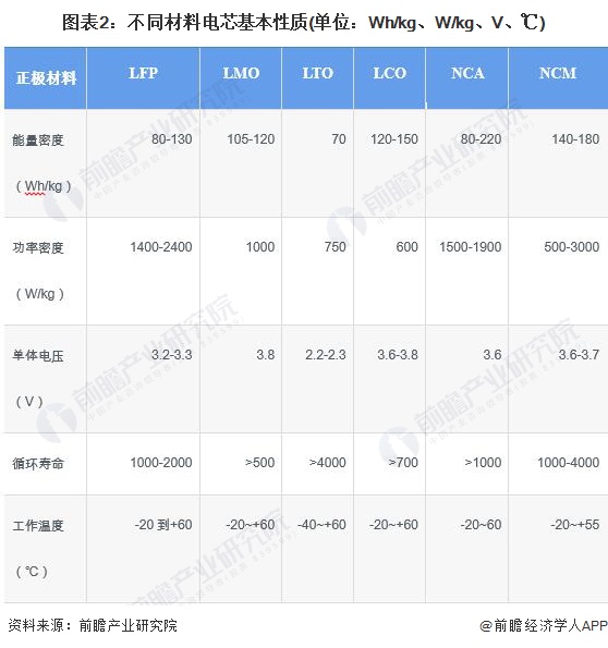 动力电池模组是指动力电池单体经由串并联方式组合并加保护线路板及外壳后,能够直接提供电能的组合体,是组成动力电池系统的次级结构之一。动力电池单体即电芯,按正极材料来分,主要包括钴酸锂、锰酸锂、磷酸铁锂以及镍钴锰酸锂三元材料等。不同材料电芯基本性质如下表所示: